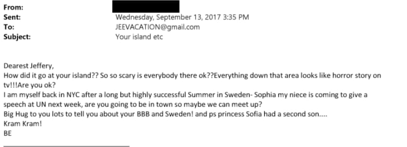 Jeffrey Epstein: "I am in the Caribbean. Does she want to come for a couple of days? I'll send a ticket."
