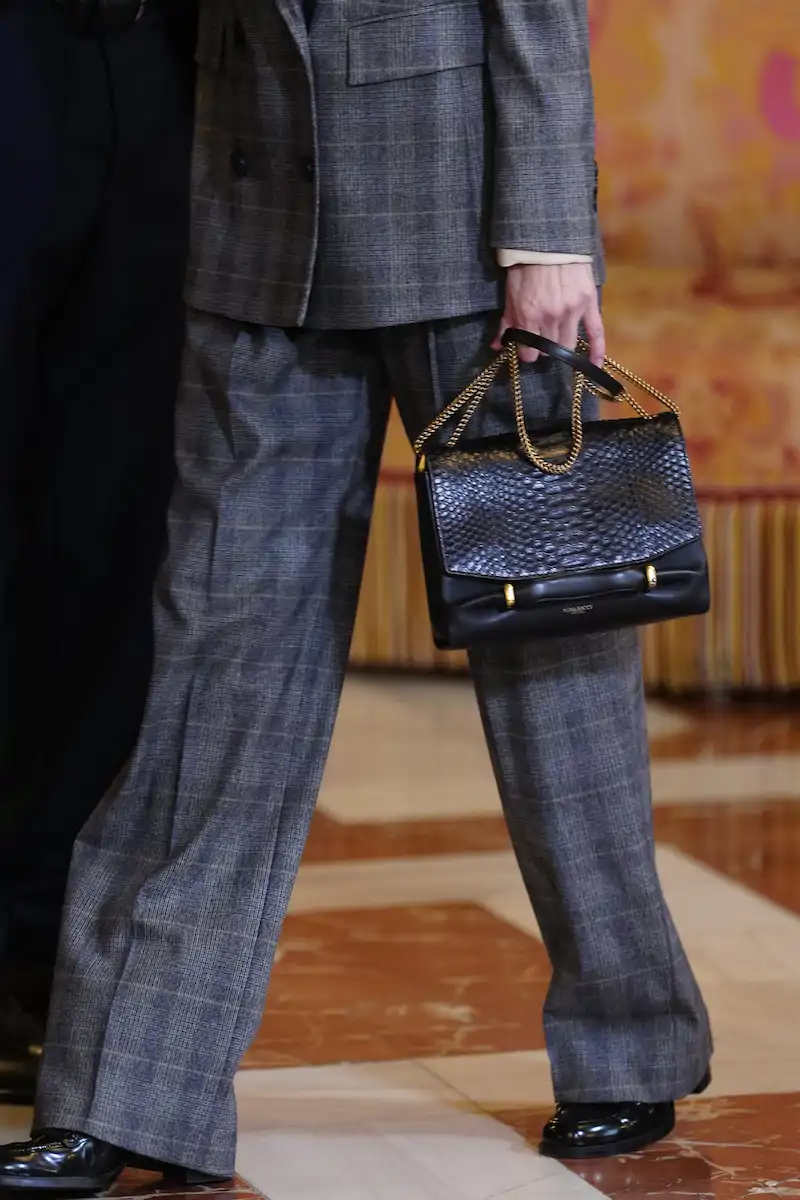 Nice jacket and everything else from the waist up. The pleat on the already oversized pants looks like a challenge. As in a challenge to wear outside in public. She should have gone better with a slim fit cut, like the March 2025 picture, and not carry an entire roll of fabric passing for pants.