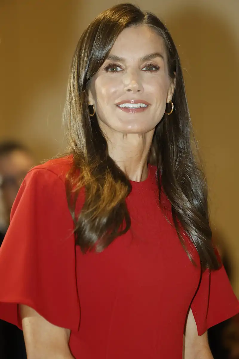 Queen Letizia in red at an event to mark World Mental Health Day today, October 10, it's an Adolfo Domínguez dress: