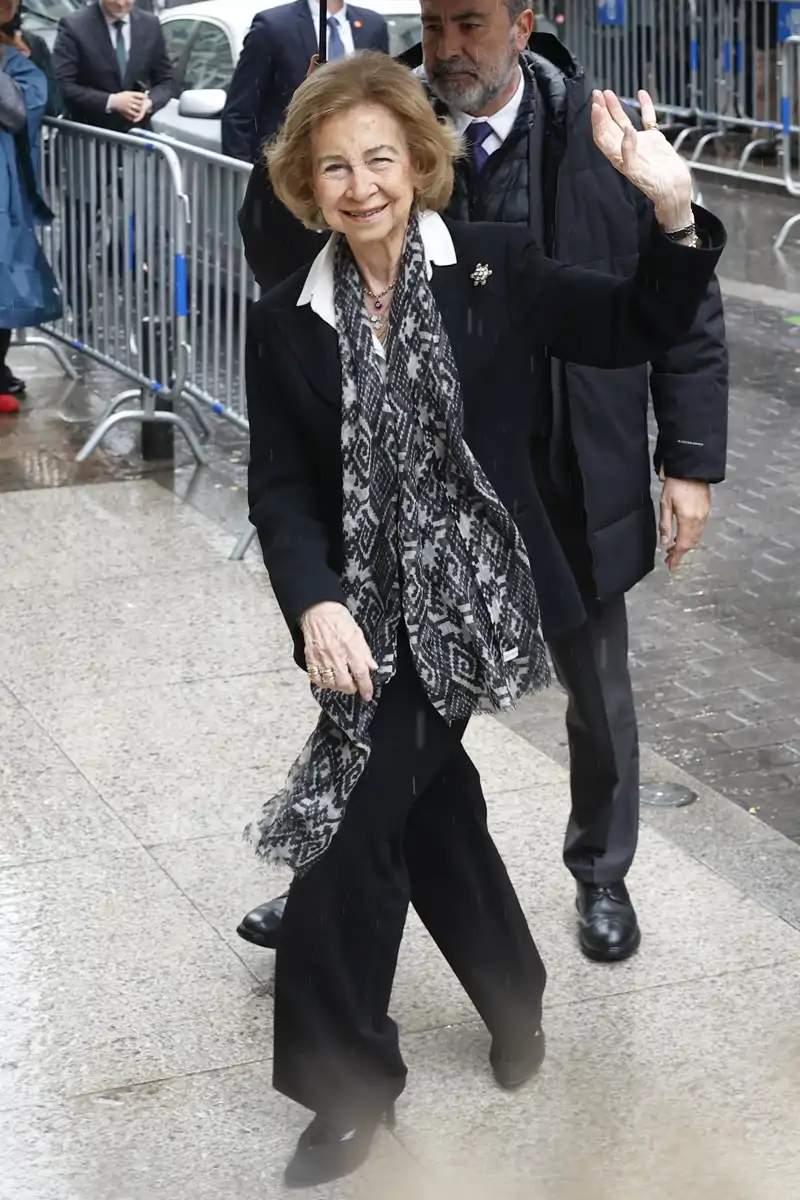 Queen Sofia will probably continue to wear dark clothing for sometime following the death of her sister , the scarf was a lovely accessory.